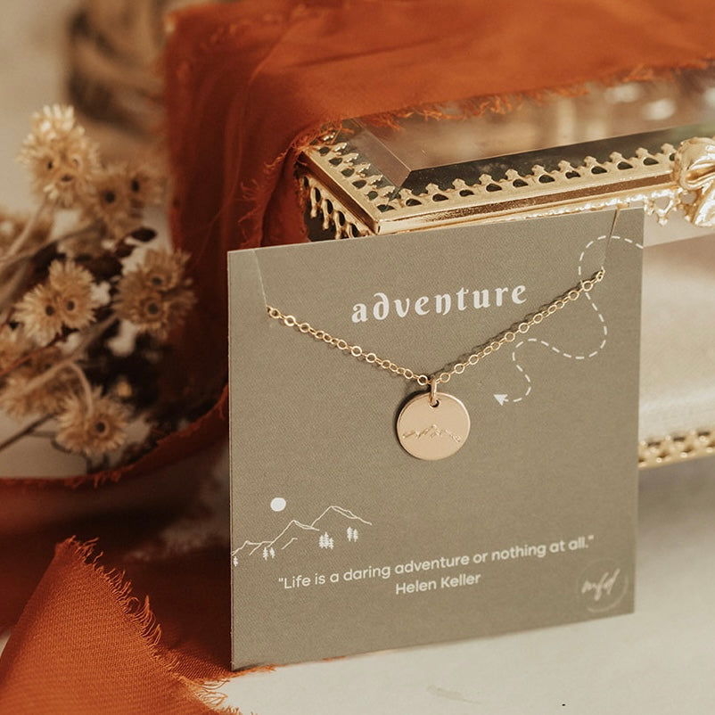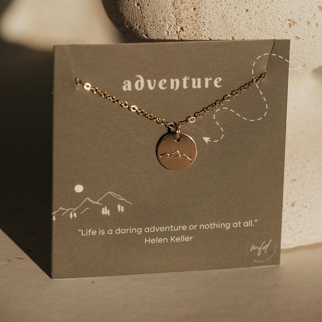 Our 1/2" disc necklace with mountains. Comes on a beautiful necklace card ready for gift giving- adventure: Life is a daring adventure or nothing at all. Helen Keller