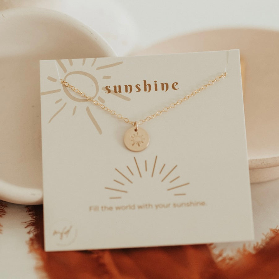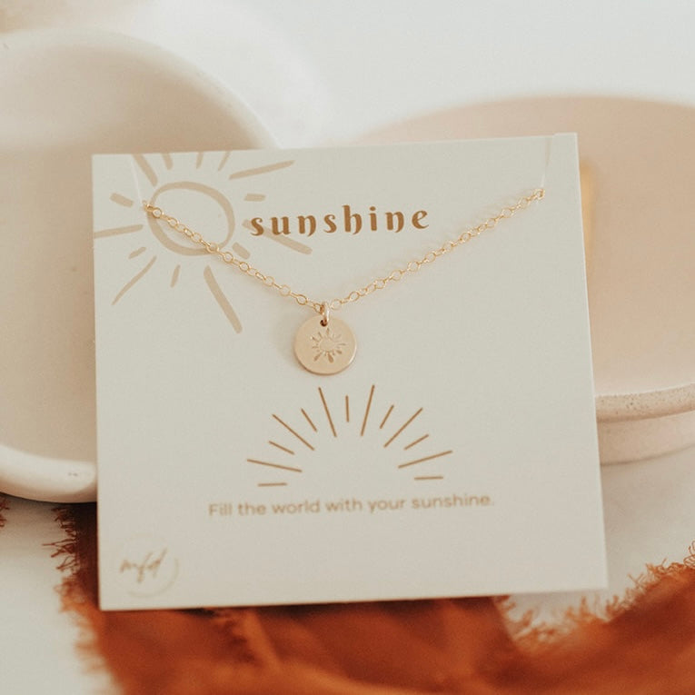 Tell her how much sunshine she brings to your world with this adorable hand stamped 3/8" disc with a sunshine! Comes on a beautiful necklace card ready for gift giving- sunshine: fill the world with your sunshine.